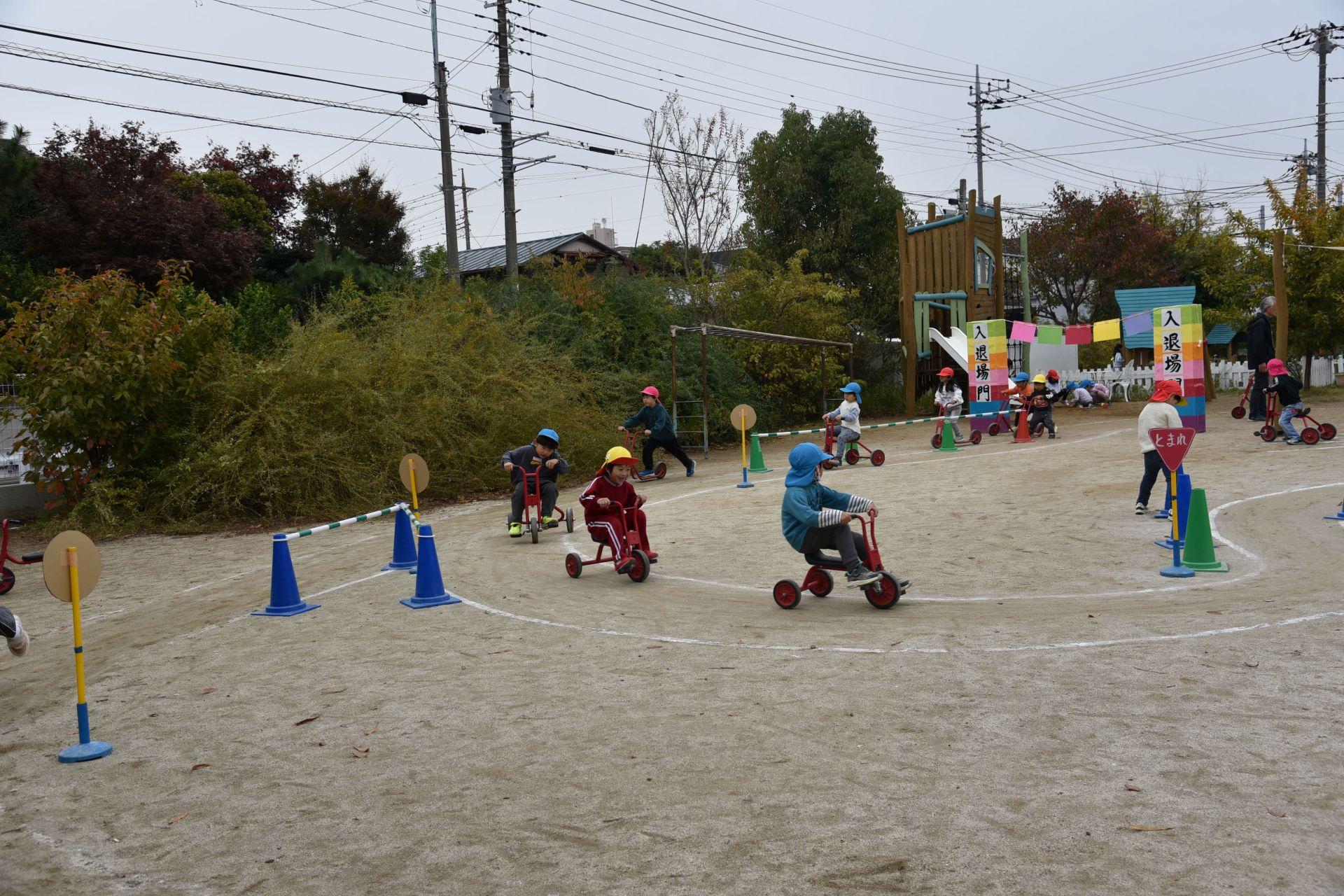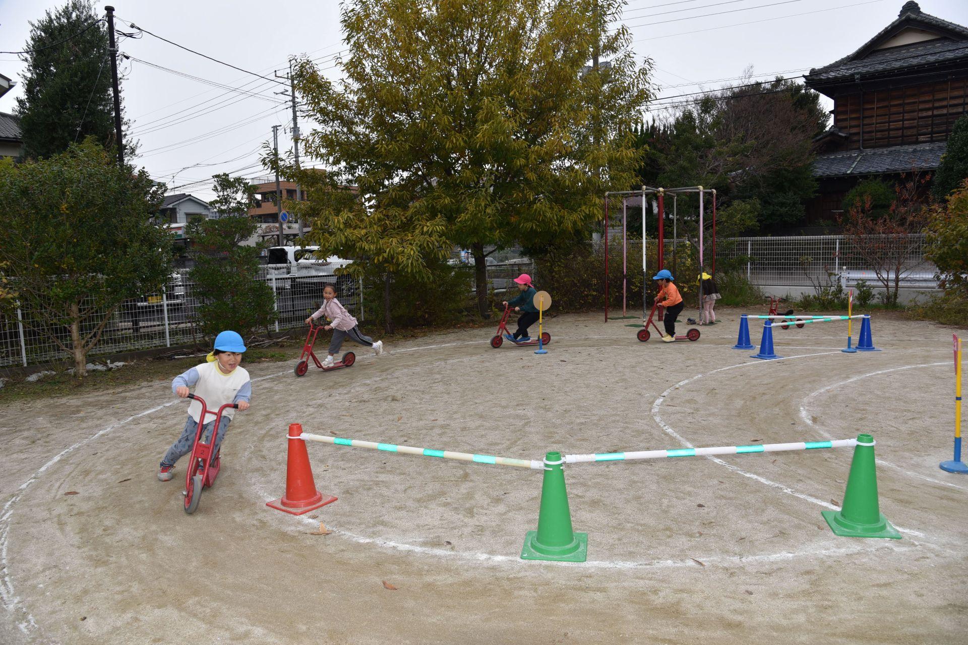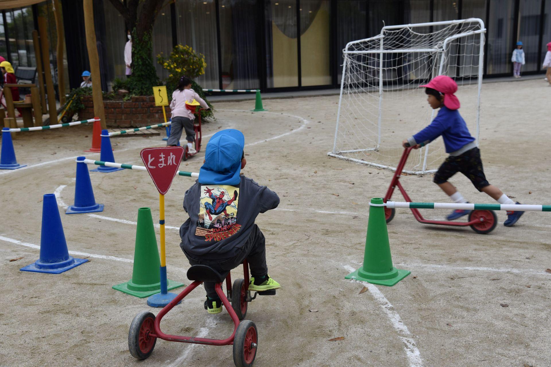 秋真っ盛りの園庭に、スクーターと三輪車のサーキットが現れました!