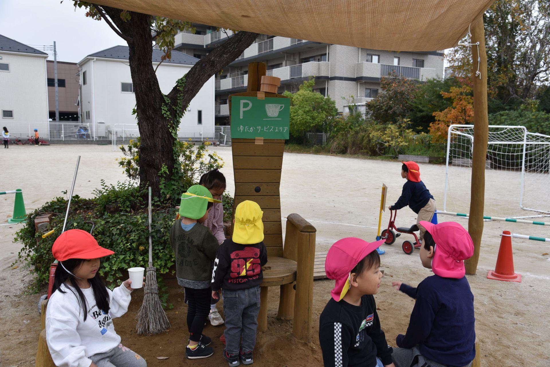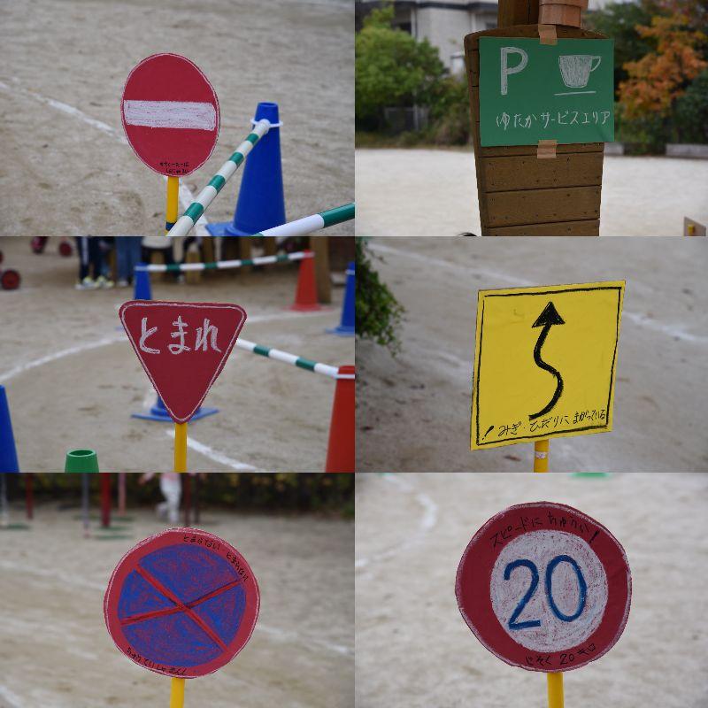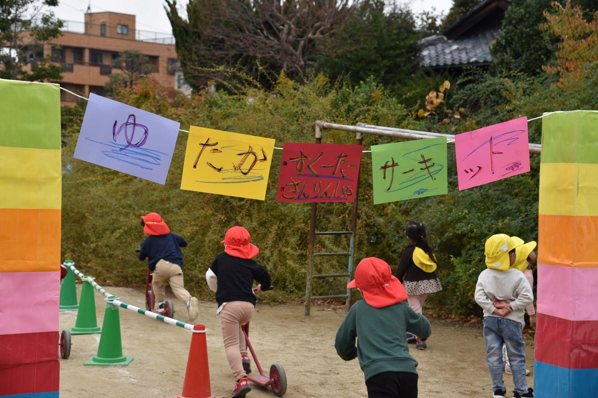 秋真っ盛りの園庭に、スクーターと三輪車のサーキットが現れました!